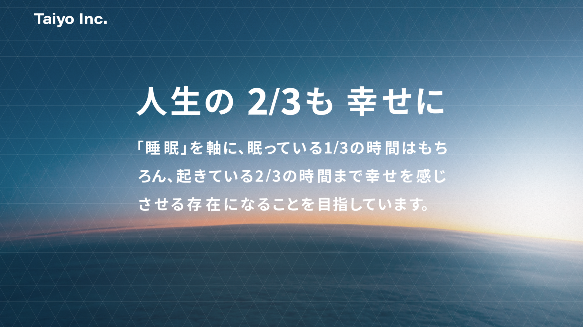 一方で、人生は睡眠だけで成り立っているわけではありません。人生の1/3を占める睡眠をより良いものにするだけでなく、残りの2/3の時間も、睡眠によってより豊かで幸せなものにしたい。それが、私たちが新たに掲げたコーポレートミッション「人生の2/3も幸せに」に込めた思いです。